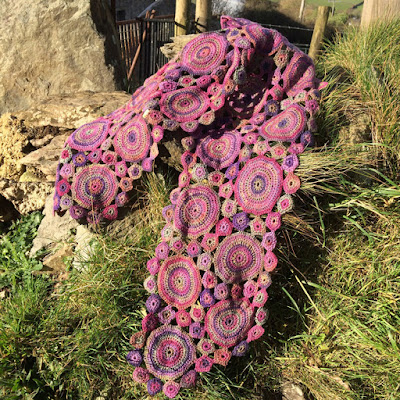 My Myrtle is in wild berry colours made with lots of different 4 ply yarns, so it is a perfect stash buster/scrap project.