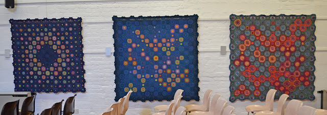 From right to left and in date order they are Zodiac, which inspired Stargazer. Stargazer the first of my Exmoor Stars series & Sagitarrius A the second Exmoor Stars blanket, Sagitarrius A is so new I haven't even written the pattern yet, I finished it on Monday night and we traveled to the show on Thursday.